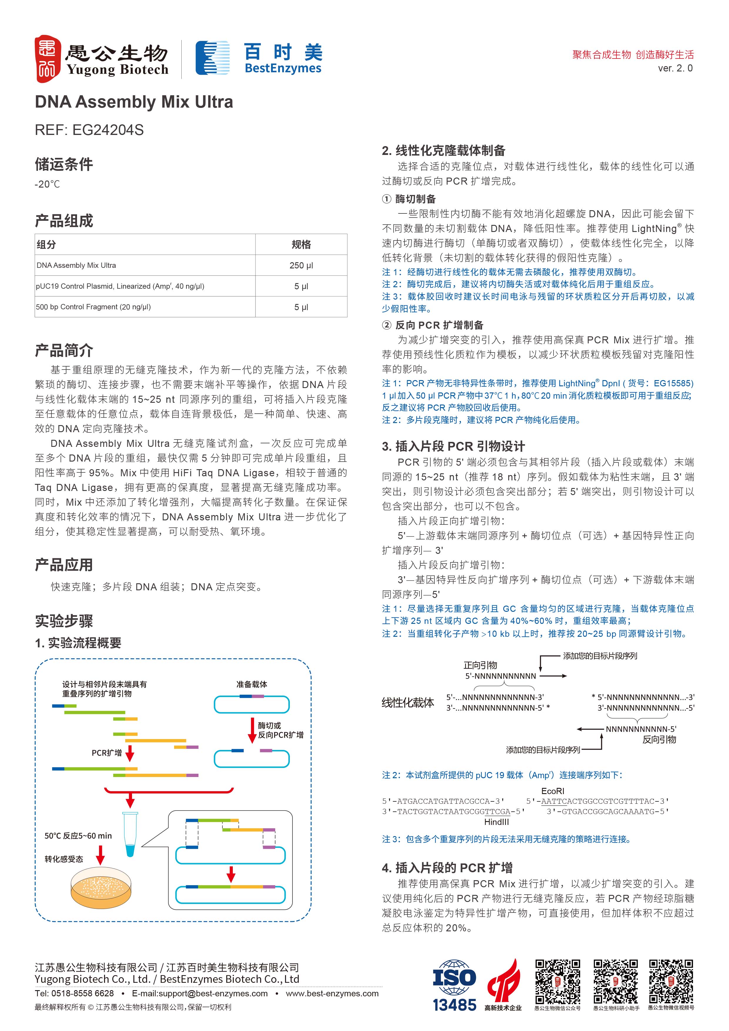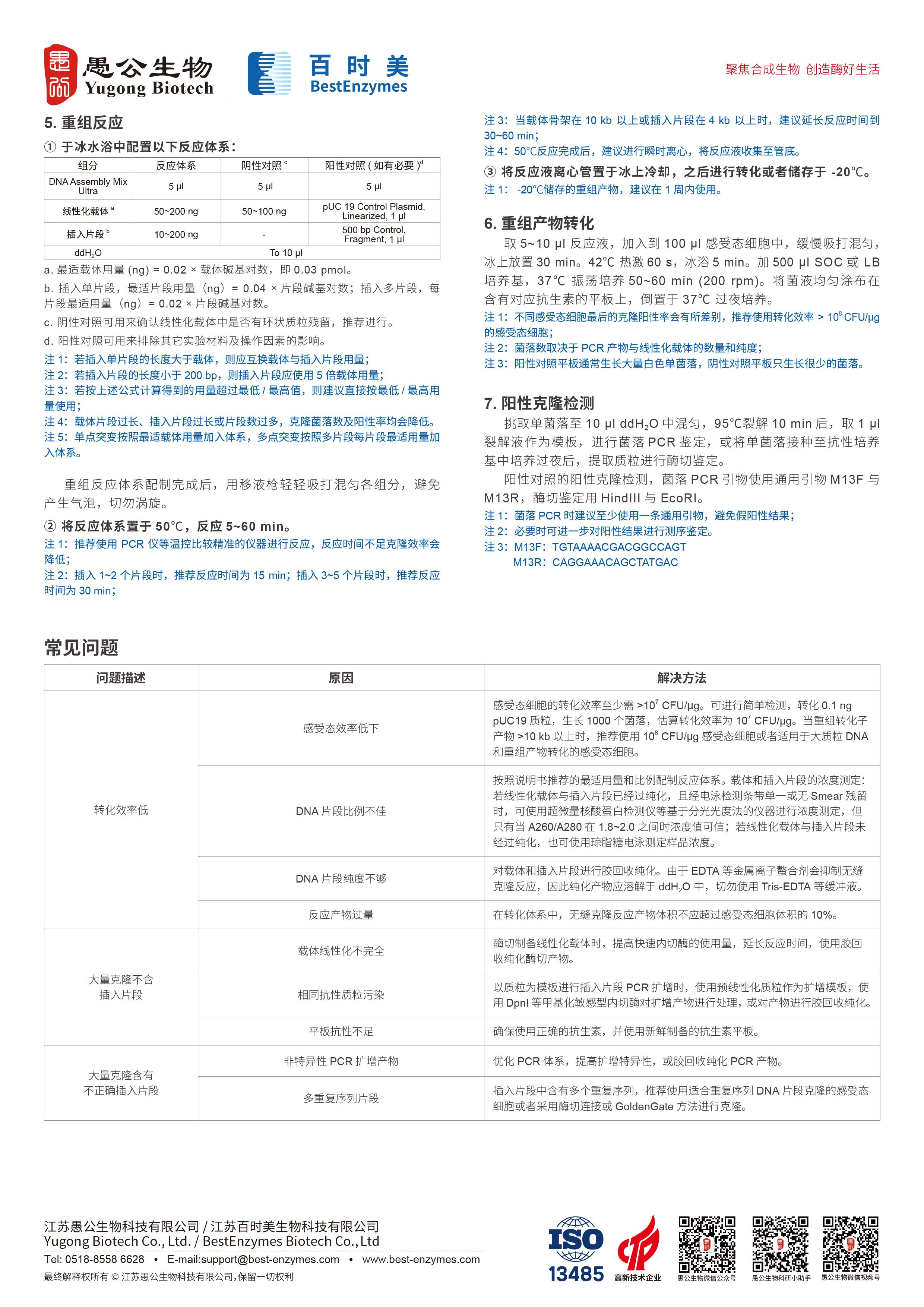 DNA Assembly Mix Ultra 无缝克隆试剂盒,一次反应可完成单至多个 DNA 片段的重组,最快仅需5分钟即可完成单片段重组,且阳性率高于 95%。Mix 中使用 HiFi Taq DNA Ligase,相较于普通的Taq DNA Ligase,拥有更高的保真度,显著提高无缝克隆成功率。同时,Mix中还添加了转化增强剂,大幅提高转化子数量。在保证保真度和转化效率的情况下,DNA Assembly Mix Ultra 进一步优化了组分,使其稳定性显著提高,可以耐受热、氧环境。